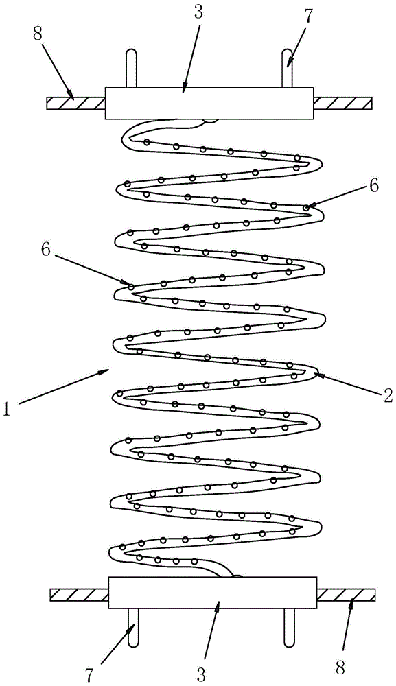 一種彈簧,如圖1至圖2所示,包括彈簧本體1,彈簧本體1由彈簧鋼絲2螺旋環(huán)繞而成,還包括位于彈簧本體1兩端的連接焊板3,彈簧鋼絲2的兩端均設(shè)置有彈性定位球體4,所述連接焊板3靠近彈簧鋼絲2的一端均設(shè)置有用于裝設(shè)所述彈性定位球體4的球形凹腔5,彈簧鋼絲2的兩端均與連接焊板3焊接;所述彈簧鋼絲2等間隔設(shè)置有多個彈性凸粒6。具體地,本實用新型結(jié)構(gòu)新穎,設(shè)計巧妙,利用在彈簧鋼絲2等間隔設(shè)置有多個彈性凸粒6,多個彈性凸粒6與彈簧鋼絲2相互抵接,提高彈簧鋼絲2被壓縮后的彈力以及恢復(fù)力,延長使用壽命;另外,在將彈簧鋼絲2的兩端與連接焊板3焊接前,先將彈性定位球體4塞入所述球形凹腔5內(nèi)對彈簧鋼絲2的兩端進行定位,然后再進行焊接,保證彈簧鋼絲2與連接焊板3的焊接精度,提高產(chǎn)品質(zhì)量;其中,彈性凸粒6和彈性定位球體4均可為彈性塑膠體或者彈性橡膠,所述球形凹腔5設(shè)置有用于供彈性定位球體4塞入的開口,所述開口的直徑小于所述彈性定位球體4的直徑。